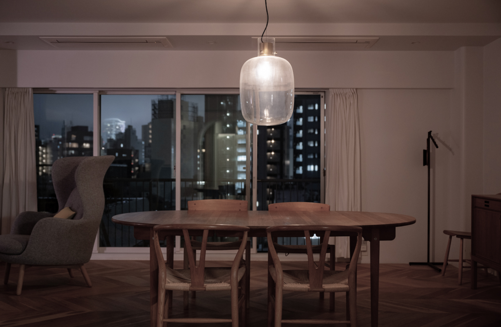 下)透過するガラスのランプが、空間に軽やかな情緒とリズムをもたらす。 -