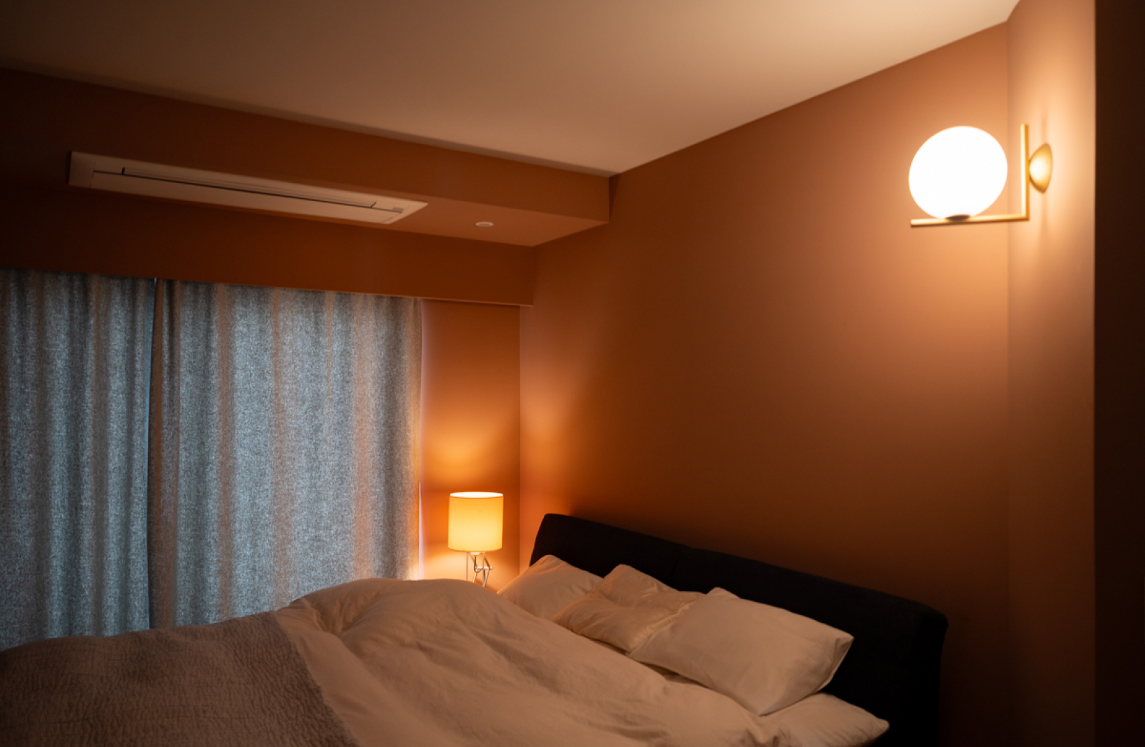 寝室は、一日の疲れをリセットし、心と身体を深く休ませるための聖域だ。大山氏が特に意識しているのは、横になったときに「光源が直接目に入らない」こと。そのため、部屋全体を照らす天井照明に頼るのではなく、壁付けのブラケットライトや重心の低い照明を取り入れ、光が直接視界に飛び込まない工夫を凝らすことが多いという。