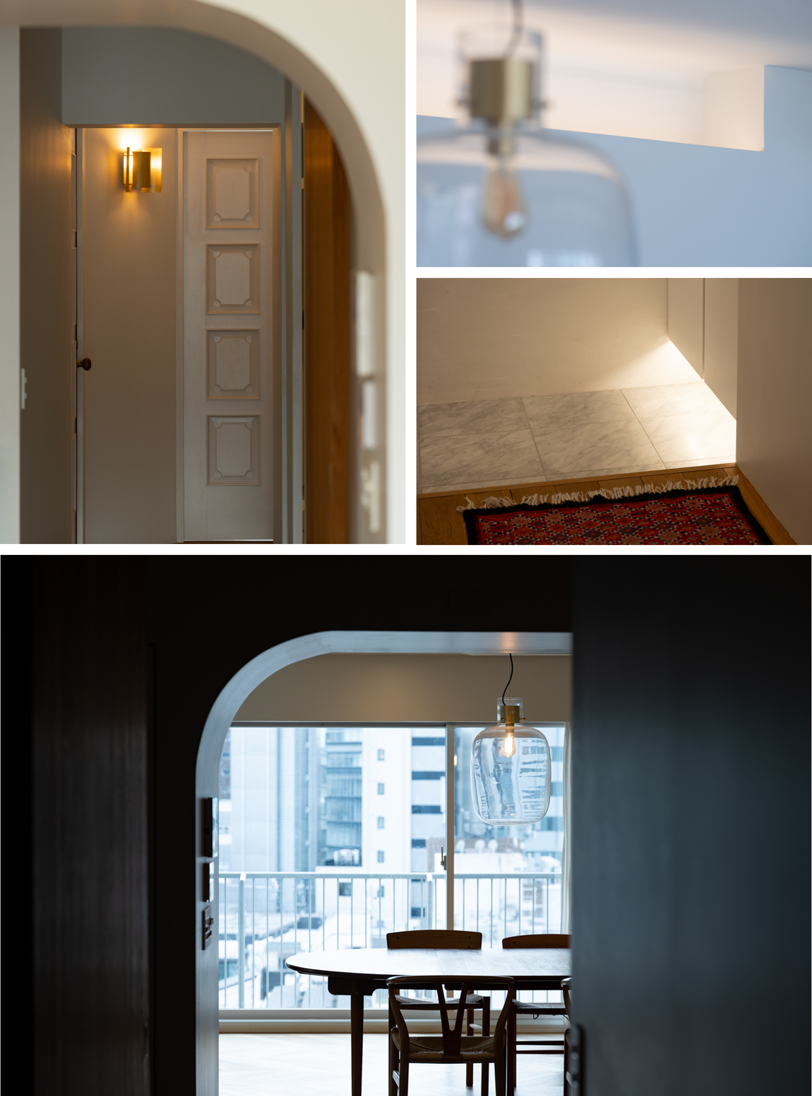 左)視線の先の柔らかな光が、住まいに奥行きと温かみを添えてドラマティックな空間に。右上)天井にも間接照明を取り入れることで空間全体が柔らかく整う。右下)玄関の足元に広がる穏やかな光が緊張を解き、プライベート空間へと優しく迎え入れる。