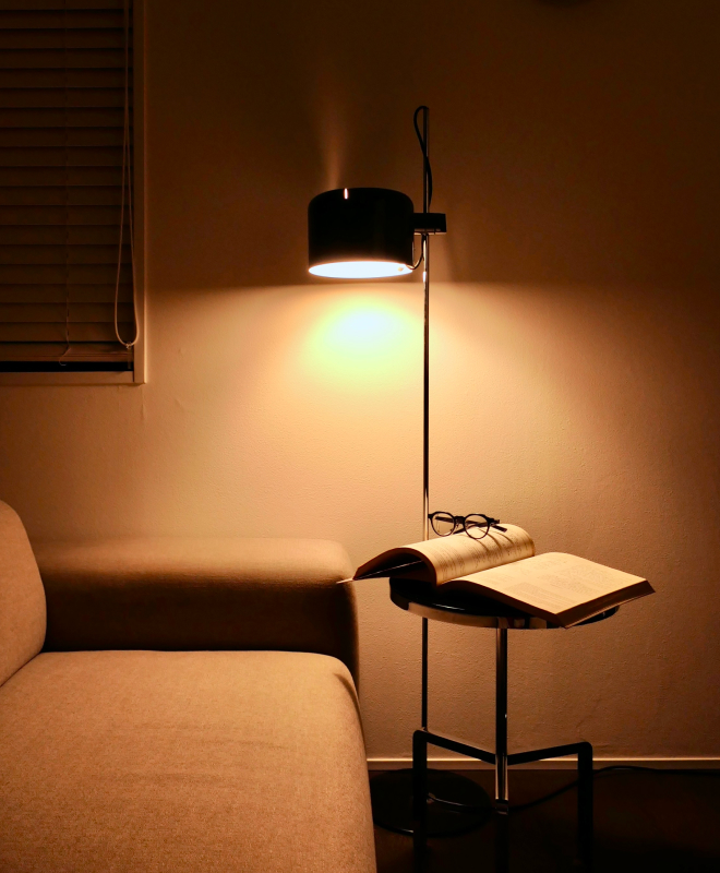 読書の相棒には、光源が直接目に触れないシェード付きのスタンドライトを。温かな光は、ソファの傍らを自分だけの静かな世界へと変えてくれる。