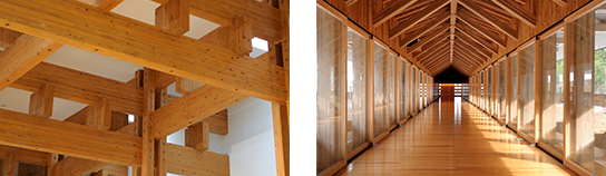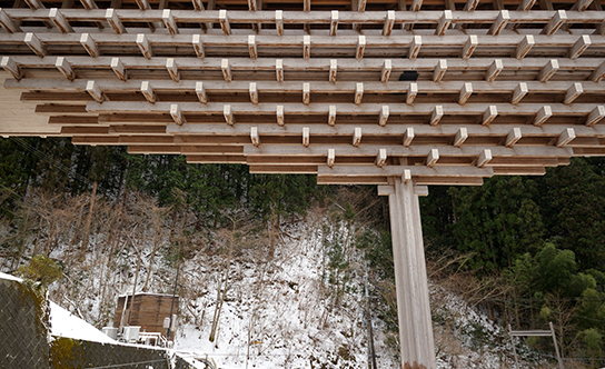 本館とギャラリーを結ぶ渡り廊下の、橋梁部分をいろんな角度から観察。木材が幾重にも組まれ、まるで神社仏閣のようにも見える印象的な構造物です。両端から刎木を何本も重ねながら持ち出して橋桁を乗せていく”刎橋”という今では忘れられた架構形式を採用しています。