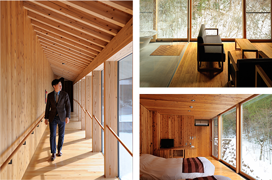 中村氏とホテル内を散策。大きな開口部のある渡り廊下。特別室の客室内のバスルームはガラス張りでリビングルームと小川のせせらぎに面しており、ガラスと鉄とコンクリートが木材と自然が調和。いかにも隈研吾作品らしい雰囲気。