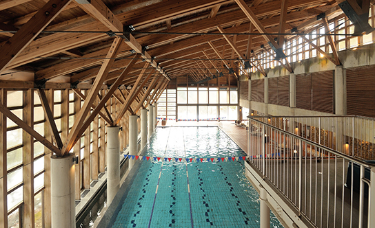プールのパブリックスペースも、梼原町産の木材を使用し、暖かい雰囲気。「隈さんが最初に手がけたのはホテルの本館ですね。時代もポストモダンな建築から、地域の産業や職人との対話の中からのものづくりに大きく変化したころですね。」次のオリンピックでスタジアムの設計を手掛ける隈研吾氏、"地方の”建築の最初の足がかりはこの雲の上ホテルなのでしょう。