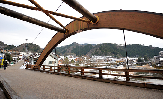 さらに隈研吾建築である「雲の上ホテル別館」と「梼原町総合庁舎」を見ようと梼原の中心部に移動。途中で出会った木製アーチ型の橋。梼原町には木製の橋が3本かかっていますが、この「梼原橋」は車両も通行できるのです。強度が必要な橋も「木製」であるところに、この町のアイデンティティが現れています。
