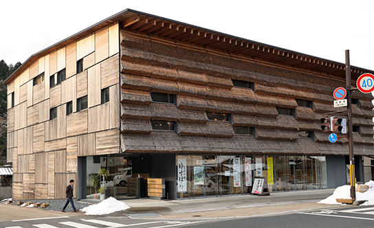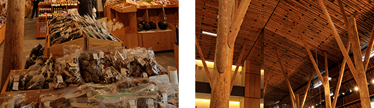 かつて梼原には茅葺き屋根の茶店があり、峠を超える人々をもてなしてきたとか。「外壁は茅を素材としたブロックですね」と中村氏。デザイン性の高い建築なのに、違和感がないのは地に根付いた素材を使っているから。その土地の「らしさ」をくみとるために、建築家は町をいろいろな方向から探っていきます。雉肉、干ししいたけ、干し大根や味噌など、マルシェの中を探索。その土地ならではの食材や料理を知ることも、大きな助けとなります。