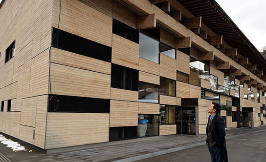 「梼原町総合庁舎」を見つめる中村氏。飛行場にも使用されるという大型スライディングドアの中には町役場だけでなく、農協や銀行、商工会議所など、公共施設が入っているのだとか。冬は降雪が多い山深いこの町の気象条件に対応し、どんな季節でも町の人々が集える場所となっているのです。