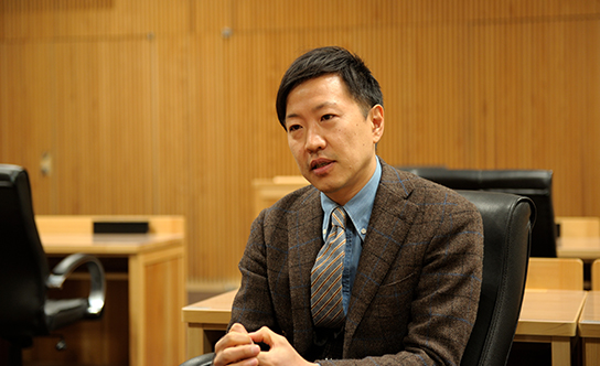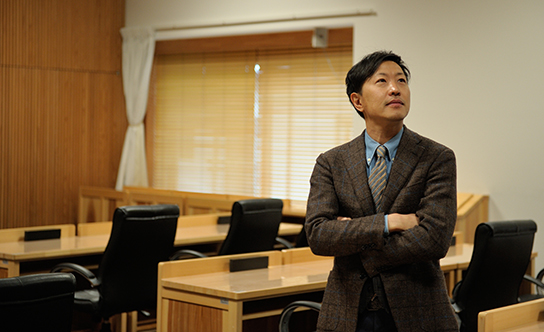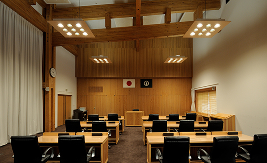 議場施設にも杉の木材がふんだんに使用され、前後の壁面には議題やプレゼンテーション用大型スクリーンが組み込まれています。こちらは災害時には町の避難所として機能するようにも、設計されているのだとか。天井に渡る大きな梁を見つめる中村氏。杉の集成材で組まれた格子状重ね構造梁は、アトリウム同様4本の過ぎ柱で1本の柱となる組柱と、格子状に組んだ重ね梁によって構成されています。「美しい木目を見せるだけではなく、木造建築における耐火性も考えられた構造です」