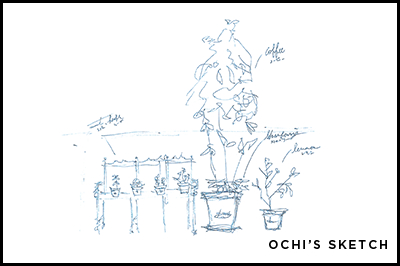 フルーツやハーブなど、育てて楽しく、後でも楽しめたり、使えたりするような植物をセレクト。ベランダに置くということで、小さいものばかりではなく、背の高いものなどを交えることによって、空間にメリハリを出し、目に入ってくる緑の量も多くすることで、リラックス効果を高めました。