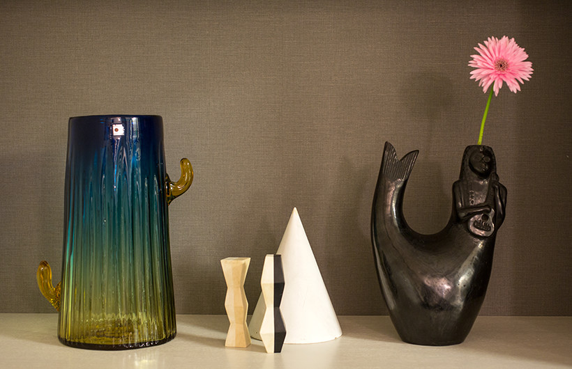畳のある「和」のスペースなのですが、あえてイタリア製のライトやメキシコ製の陶器など、明るくデザイン性に優れたものを選びコーディネートしました。ポイントは床の間に飾ったライトと陶器。床の間には背の高いものを置きたいと思っていたので、丁度良いかなと。ライトは80年代のもので、イタリアデザイン界の巨匠エットーレ・ソットサスの作品。ソットサスがデザインした一番有名なプロダクトは、MOMAにも保存されているオリベッティのタイプライターですが、彼が結成し所属した“メンフィス”というデザインチームは、デザイン界に「ポストモダン」の新風を吹き込み、世の中に熱狂的に迎えられました。合わせた陶器はメキシコの70年代のもの。この作品は夫婦の作家が手掛けていて、旦那さんが形を作り、奥さんが絵付けをする。このなんとも言えない色使いが魅力なんですよね。棚のほうは、国も年代もジャンルもバラバラですが、壁の色とオブジェの色や素材感などを考えて仕上げました。