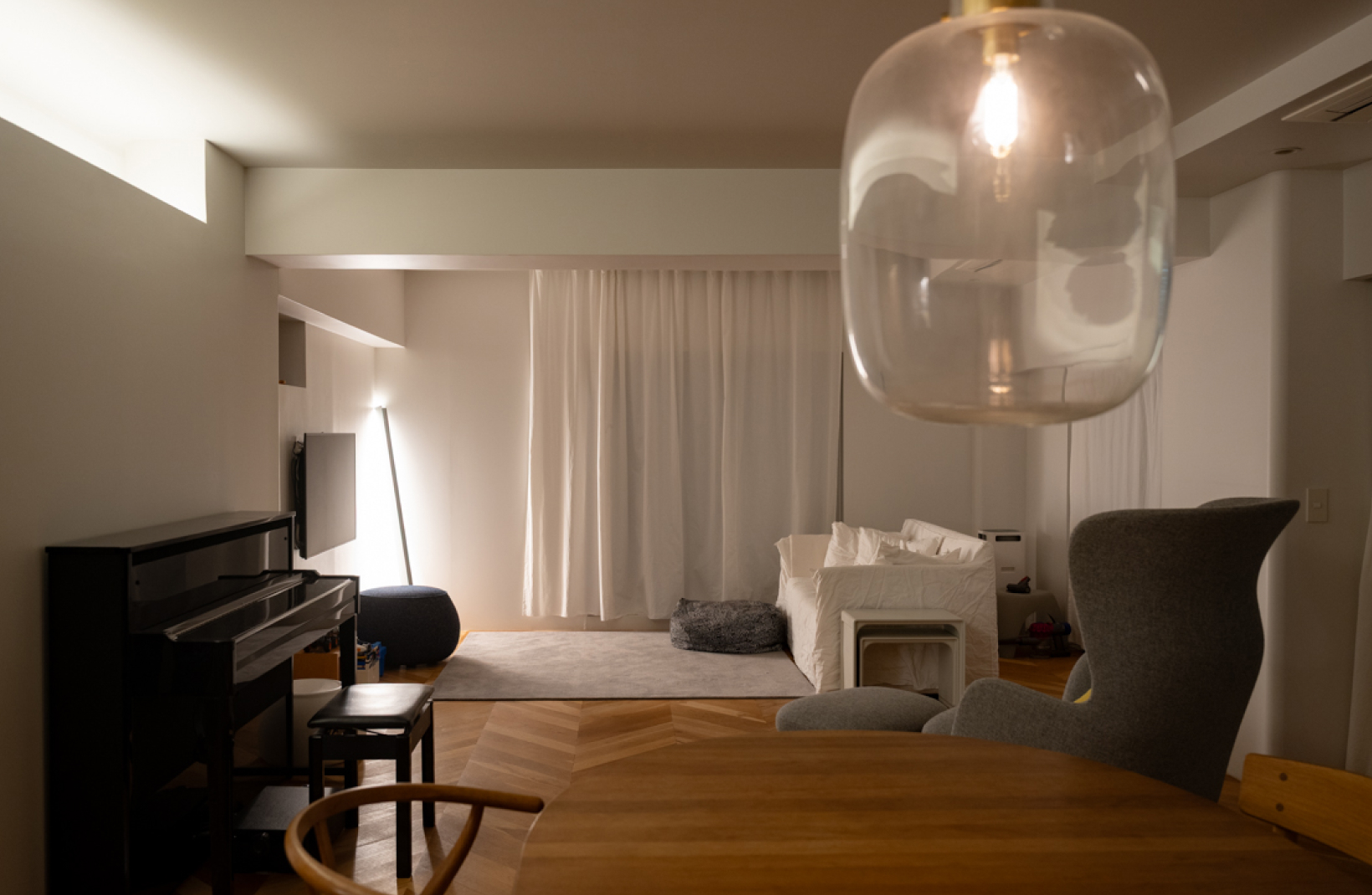 大山氏自身は、「煌々とした照明は落ち着かないので、できるだけ最低限の光で暮らしたい」と明かす。日中は移ろう自然光をそのままに受け入れ、夜は調光でその時の気分に寄り添う明るさへと整えていく。そうして光の重なりを慈しむ時間は、単なる「部屋」を、かけがえのない「住まい」へと育ててくれるはずだ。