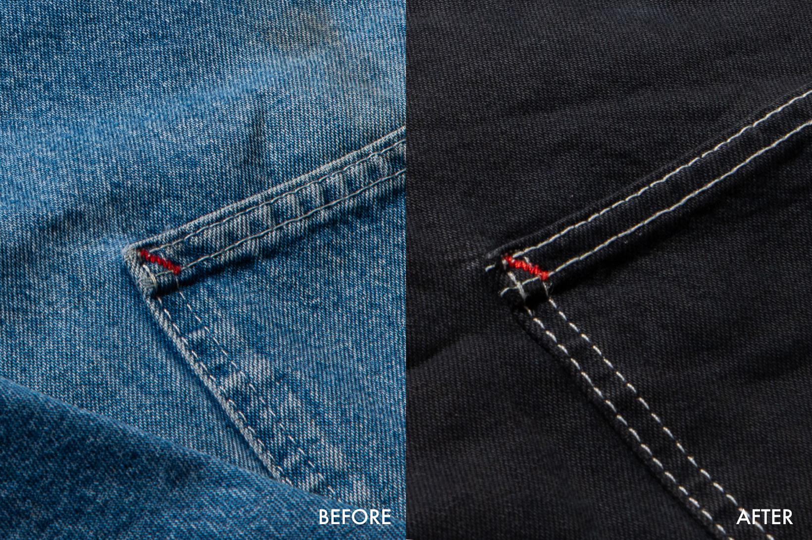 右が通常の染めのみ、左が「深黒加工」を施した生地。光を吸収し、ブラックホールのような絶対的な黒を表現する。