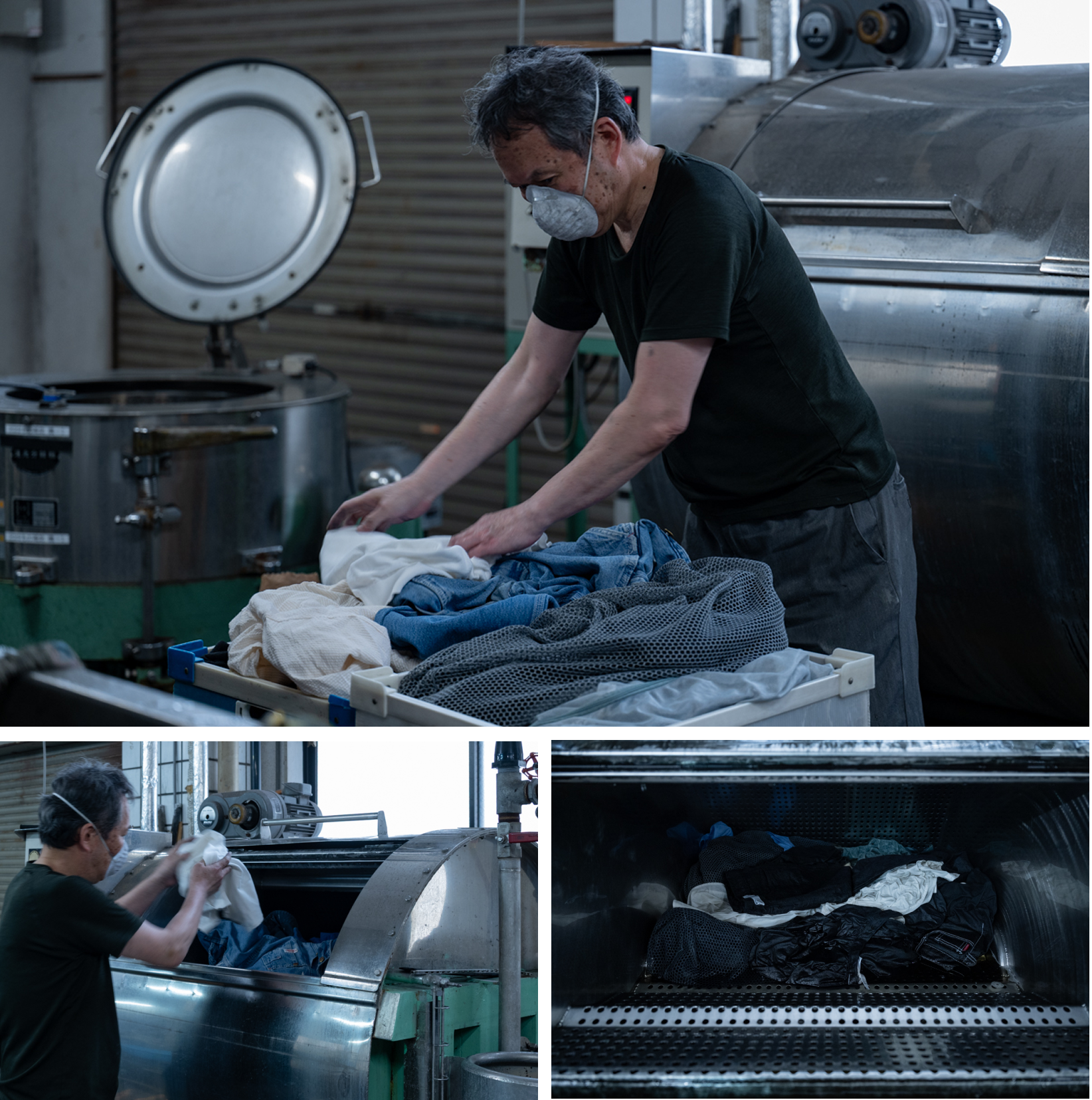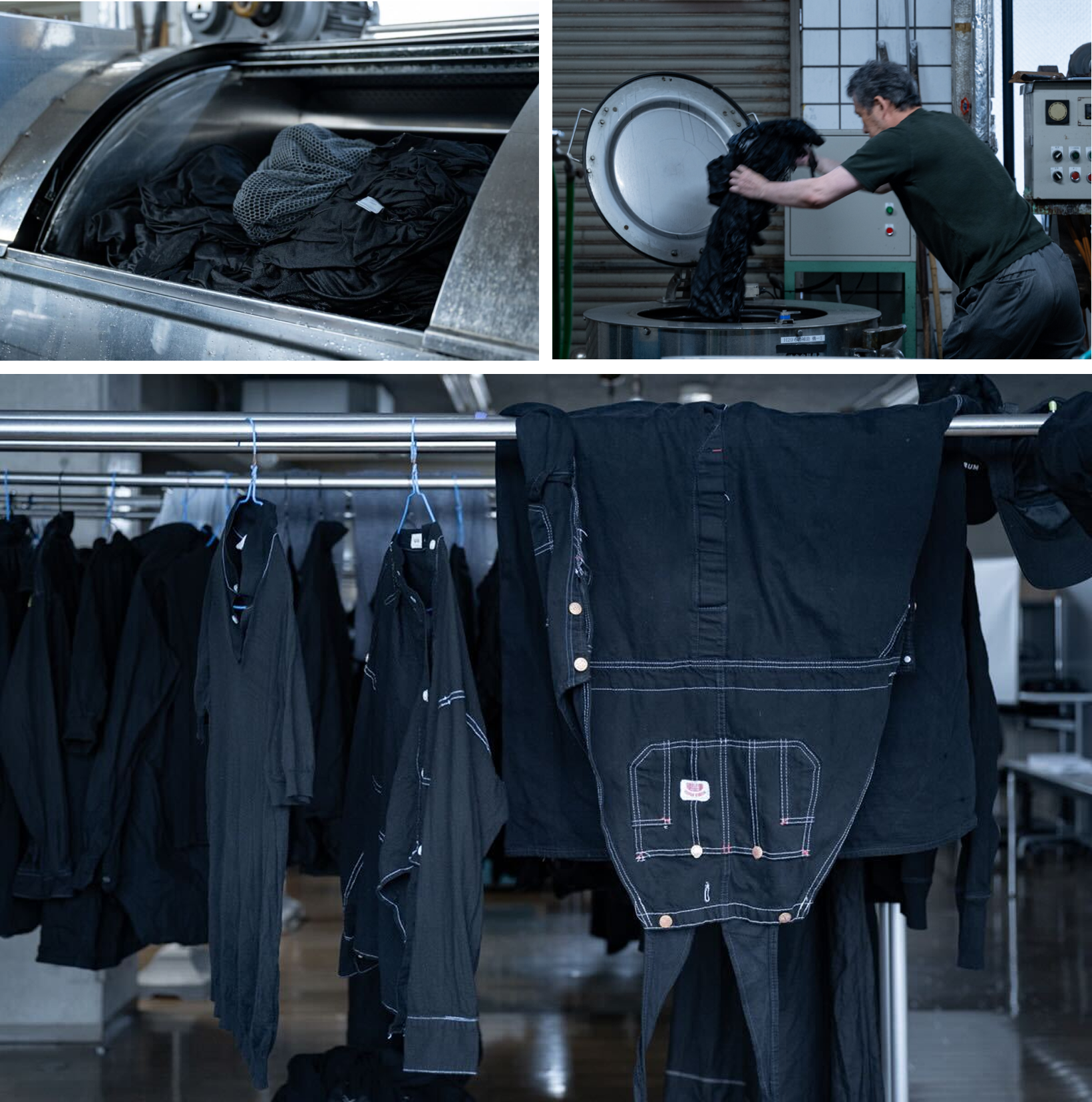 約2時間後、染め終えた服を機械から取り出し一度干す。完全に乾かした後、さらに深黒加工を施す。天然素材以外の糸は黒く染まらないため、ステッチが強調されるなど、思いがけない表情が生まれるのも染め替えの楽しみ。